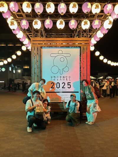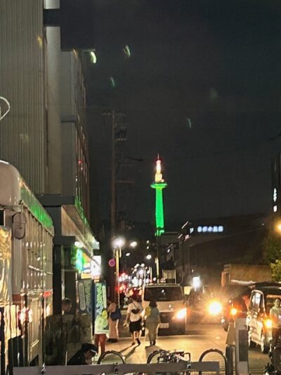 帰りにみんなで記念撮影をして京都駅のほうを見たら京都タワーが