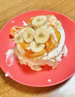 そしてスポンジを2段に切り、適当に家にある柿とバナナも用意して