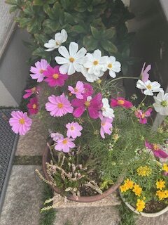 お花も咲き終わったので秋らしくコスモスを寄せ植えしました。
