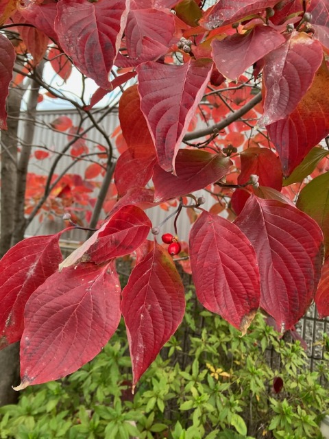 通勤途中のハナミズキ。もう真っ赤です。